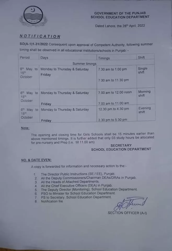 The Punjab School Education Department government issued a notification regarding the School timing. As the month of Ramadan ends, the competent authority issued the summer school timetable for all private and public schools. The SED Punjab changed the school timing from 6th May 2022. They officially announced the timing of single, morning, and evening shifts. It is also pertinent to mention that the opening and closing time for Girl’s Schools shall be 15 minutes earlier than the above-mentioned timings. It is further added that only 03 study hours be allocated for pre-nursery and Prep (i.e. till 11:00 am). For more details, keep scrolling