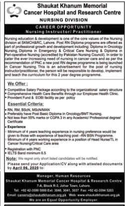 Shaukat Khanum Memorial Cancer Hospital opens applications for all Pakistani Nationals females who have done BN, BM, B.Sc. Nursing, MSc Nursing degree, and 4 Years of experience in any nursing institute. Jobs are open for the post of Senior Nursing Instructor in Shaukat Khanam hospital in Lahore city of Punjab, Pakistan, permanently. The last date to apply is 2020-04-06. For further information is given below.