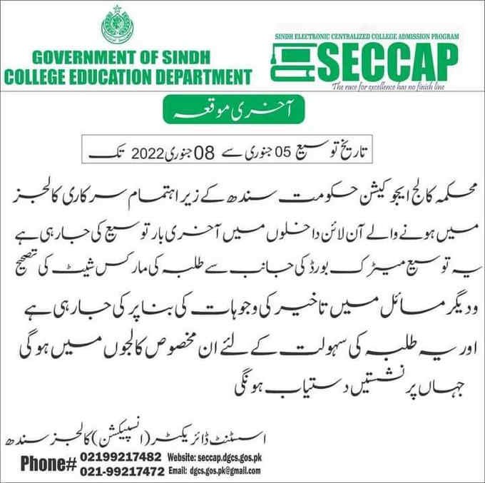 The government of the Sindh College Education Department (SECCAP) has announced extending the admission date. SECCAP extended the date for 1st-year admission last time. So, now students can apply through the SECCAP website by 08 January 2022. So, visit the official website and apply online.