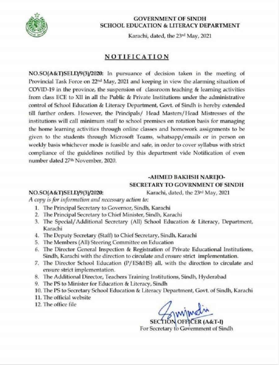 On 23rd May 2021, Sindh Education Minister Saeed Ghani announced to suspend all educational institutions due to the worsening condition of COVID-19. In a latest notification, he announced that 50% students in all public and private educational institutions including teachers and headmasters will call for managing home learning activities and online classes. Moreover, the homework can be assigned to the students through online platforms or in-person on a weekly basis whichever mode is feasible and safe, in order to cover syllabus with strict compliance of the guidelines.