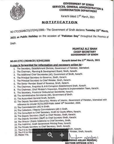 On 17 March 2021, Sindh Government issued a notification regarding the holiday on Pakistan Day. However, this notification is from the services, General Administration and Coordination Department of Sindh under notification No. CTC/(SGA&CD)/27(04)2006.