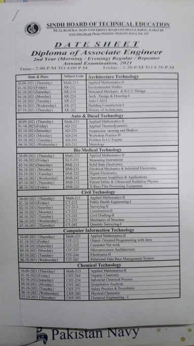 On 28th September 2021, the Board of Intermediate Education BIEK issued a notification regarding the DAE exams. According to the details, it is to inform all that the Sindh Technical Board announces the DAE 2nd Year exams timetable 2021. Candidates who enrol in this program will now have a chance to apply by following general terms and conditions. For the ease of students, we have uploaded the date sheet. Due to the COVID-19, all exams were postponed. But now BIEK schedules the DAE Exams. Students can check and download the date sheet from our website. For more details, keep scrolling