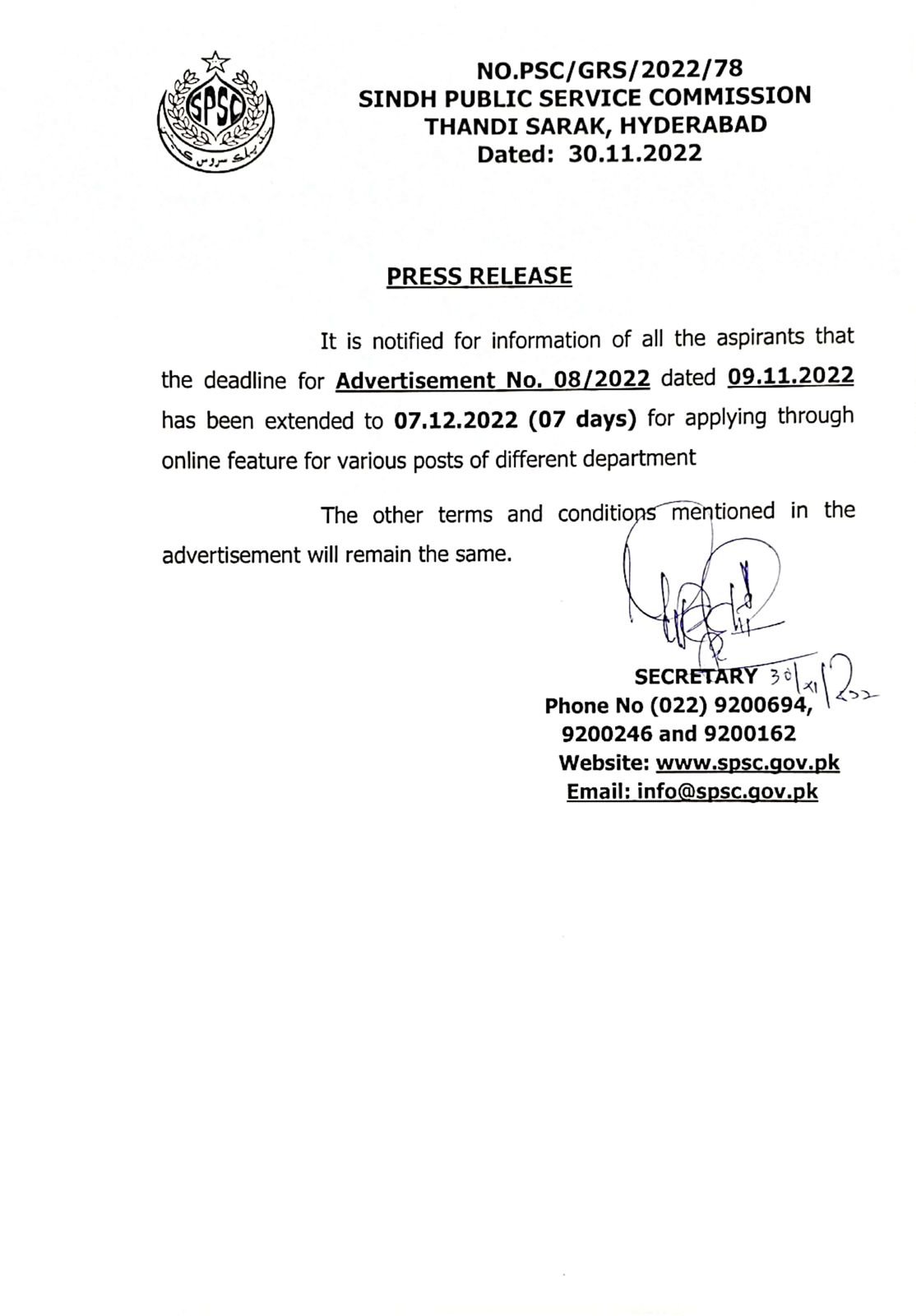 The Sindh Public Service Commission SPSC issued the notification regarding the extension in the date of SPSC. Per the notification, the Sindh Public Service Commission SPSC extends the date of advertisement no 08/2022. Earlier, the last date for submission of the SPSC advertisement no 08 application is 9th November 2022. But now, SPSC issued a new date for application submission. Now, the last date for submission of the SPSC job application is 7th December 2022. Candidates who cannot apply for SPSC Adv no 08/2022 jobs will now apply before 7th December 2022 (Wednesday). From here, you can easily check the complete details of the SPSC job 08/2022, along with the eligibility criteria and application procedure.