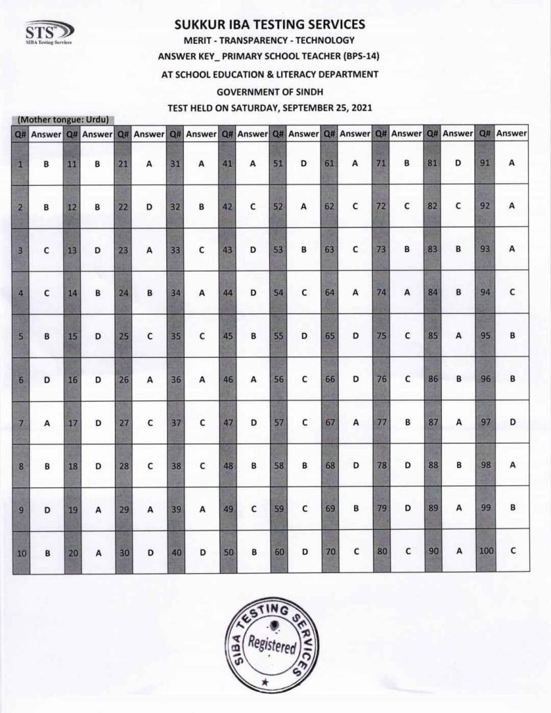 Below is the PST (BPS-14) answer keys 2021 announced by IBA Sukkur University www.iba-suk.edu.pk for the test held on 25 September 2021; thus, you can check the keys of your concerned subject.