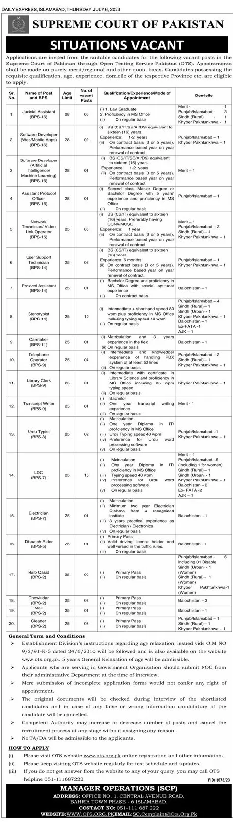 Supreme Court of Pakistan Vacant Positions