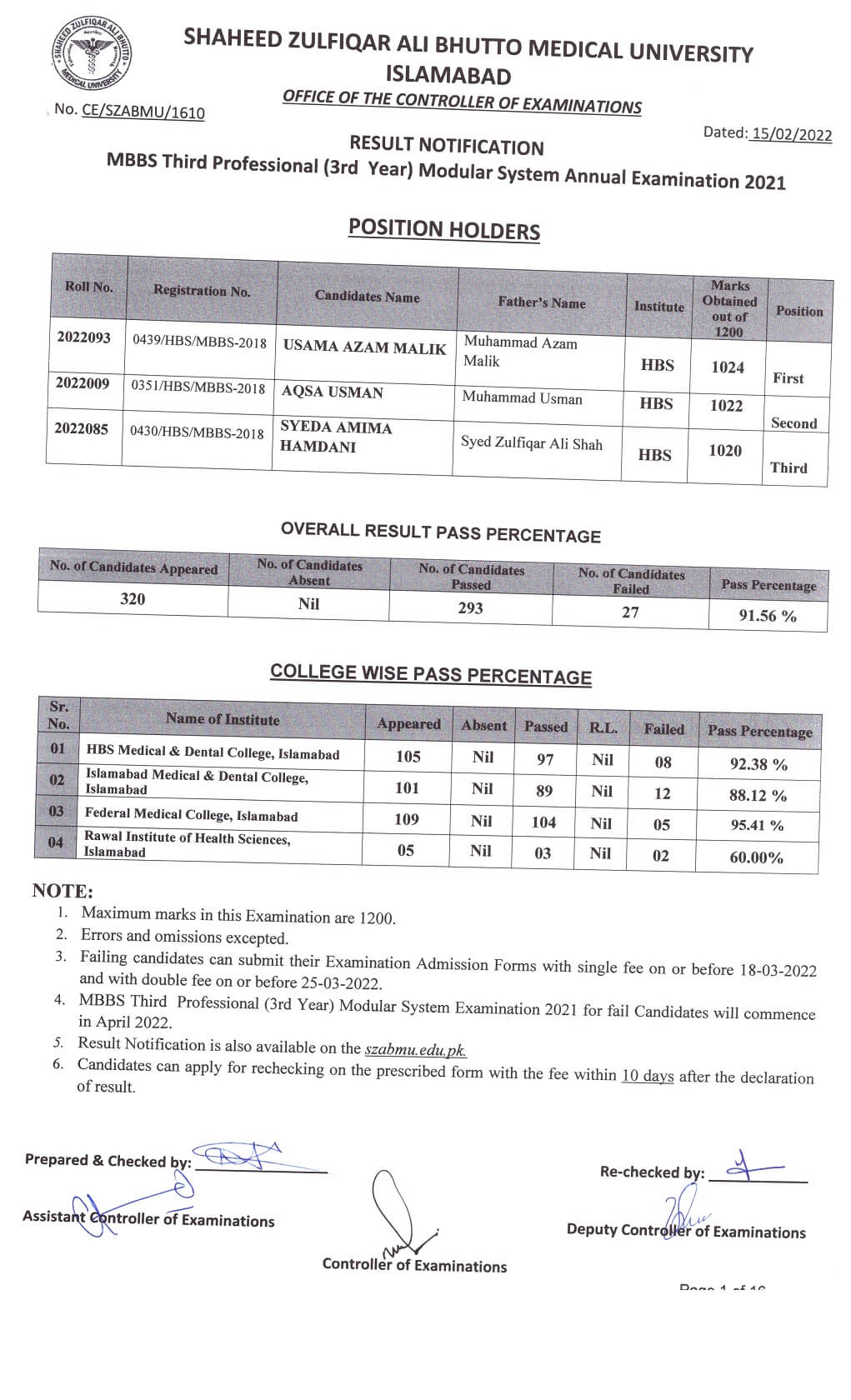 According to the details, we are glad to inform you that Shaheed Zulfiqar Ali Bhutto Medical University declares the result of the MBBS (3rd Professional) annual examination 2021. Applicants who sit in the annual examination of the MBBS programs will now check the result online from here. According to the details, around 320 candidates appeared in the MBBS3rd professional annual examination, in which 293 candidates successfully passed the exams, and only 27 candidates failed this test. Not only this, but they have also uploaded the list of the position holders or toppers.