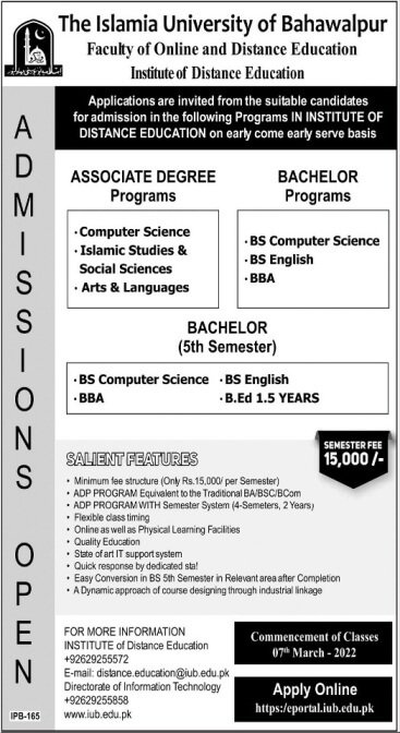 The Islamia University of Bahawalpur offered the following bachelor’s (5th semester) degree programs under distance education. Take a look