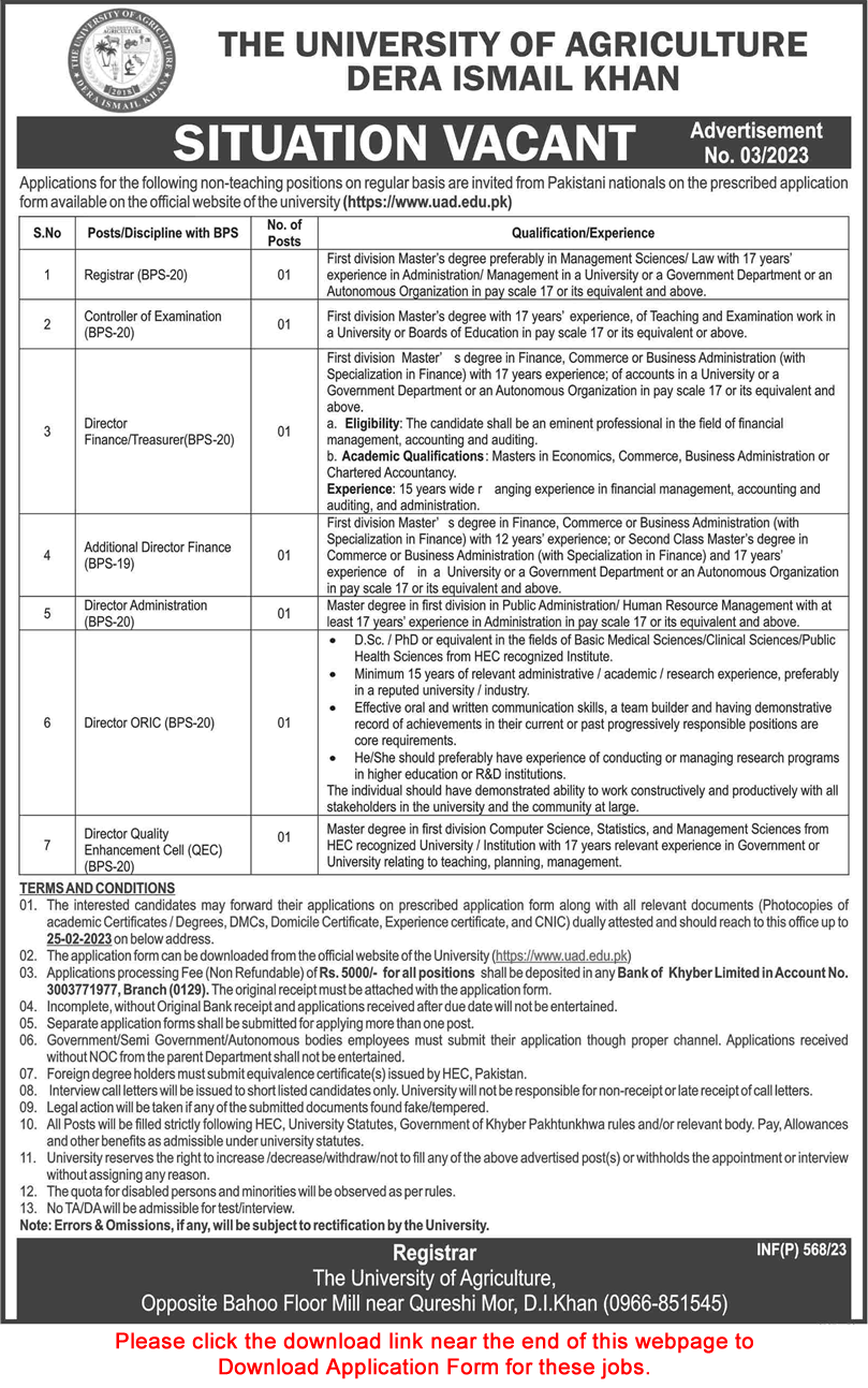 Are you a resident of Dera Ismail Khan and looking for Education sector jobs? If yes, then you arrived at the perfect place. Today, the University of Agriculture Dera Ismail Khan officially announced the latest career job opportunities for session 2023. The University of Agriculture advertised this job in Dawn Newspaper. They are highly needed, well-motivated, and talented individuals for the position of Registrar, Controller of Examination, Director Finance / Treasurer, Director Administration, Director ORIC, Director Quality Enhancement Cell (QEC), and Additional Director Finance. The job position is in Dera Ismail Khan. The last date for submission of UA Dera Ismail Khan job application is 25th February 2023