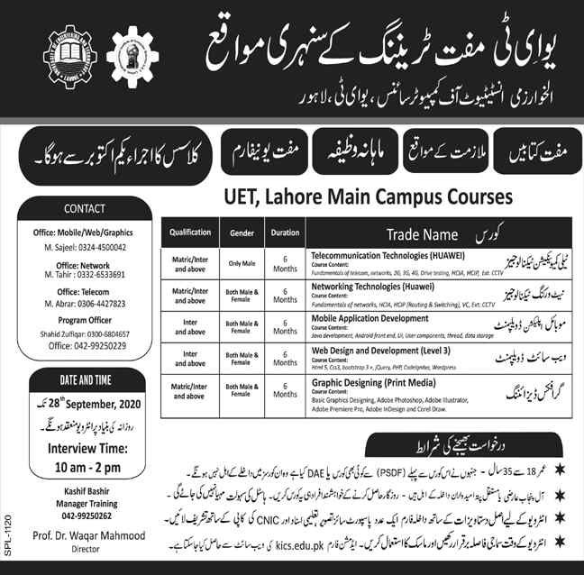 Punjab Skill development foundation PSDF has announced various technical IT training courses In the UET Lahore for the young generation. They offer various IT programs such as Telecommunication Technologies (for Male only), Networking Technologies, Mobile Application Development, Website Development and Graphics Designing. The duration of this training program is six months. The reason to offer this technical program is to polish and train students with technical and IT skills. Those who want to learn some above-mentioned technical course must enrol before the last date. The