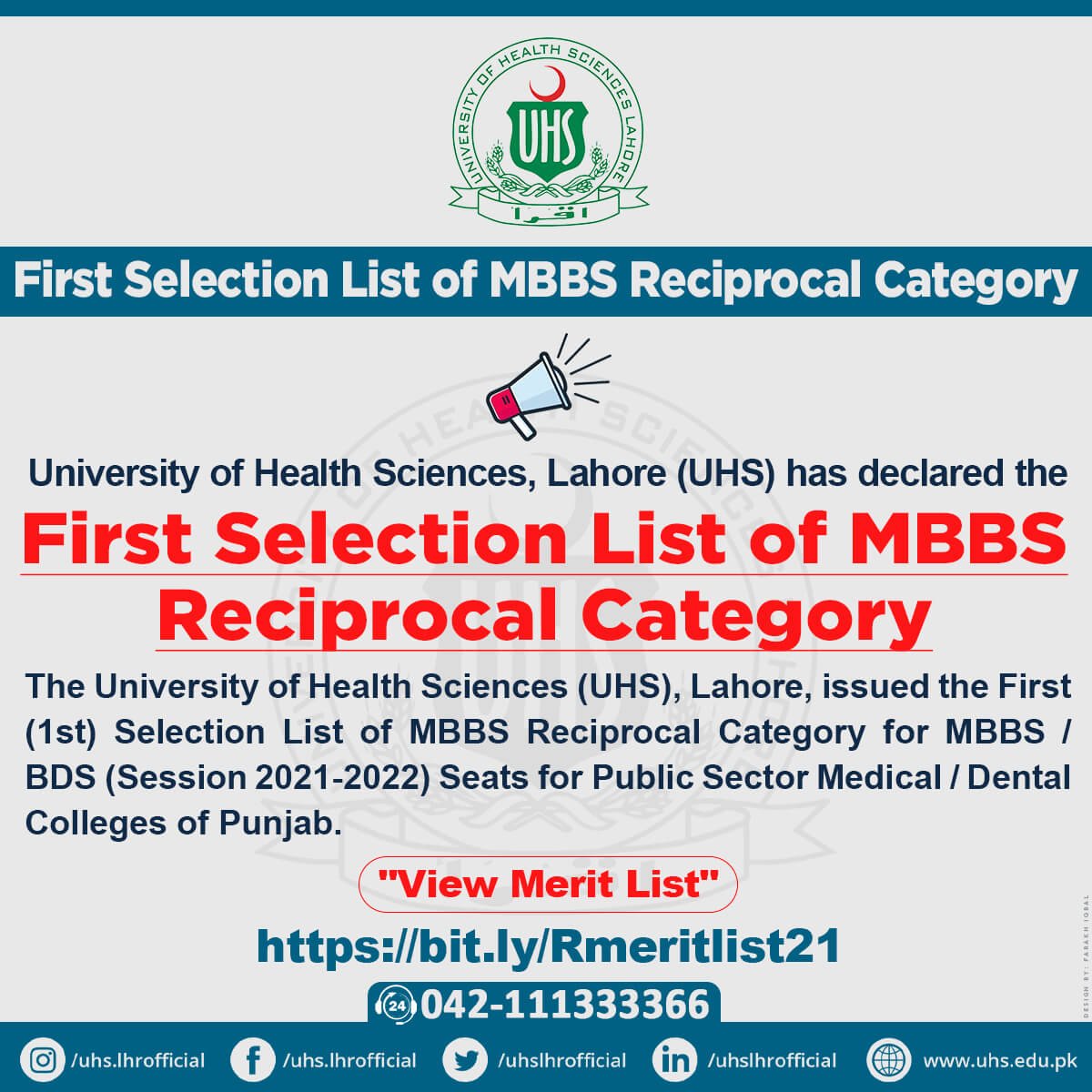 • To view the first selection list of the MBBS and BDS programs of reciprocal category, visit the given link (https://uhs.edu.pk/result/reciprocalmeritlist21.php)