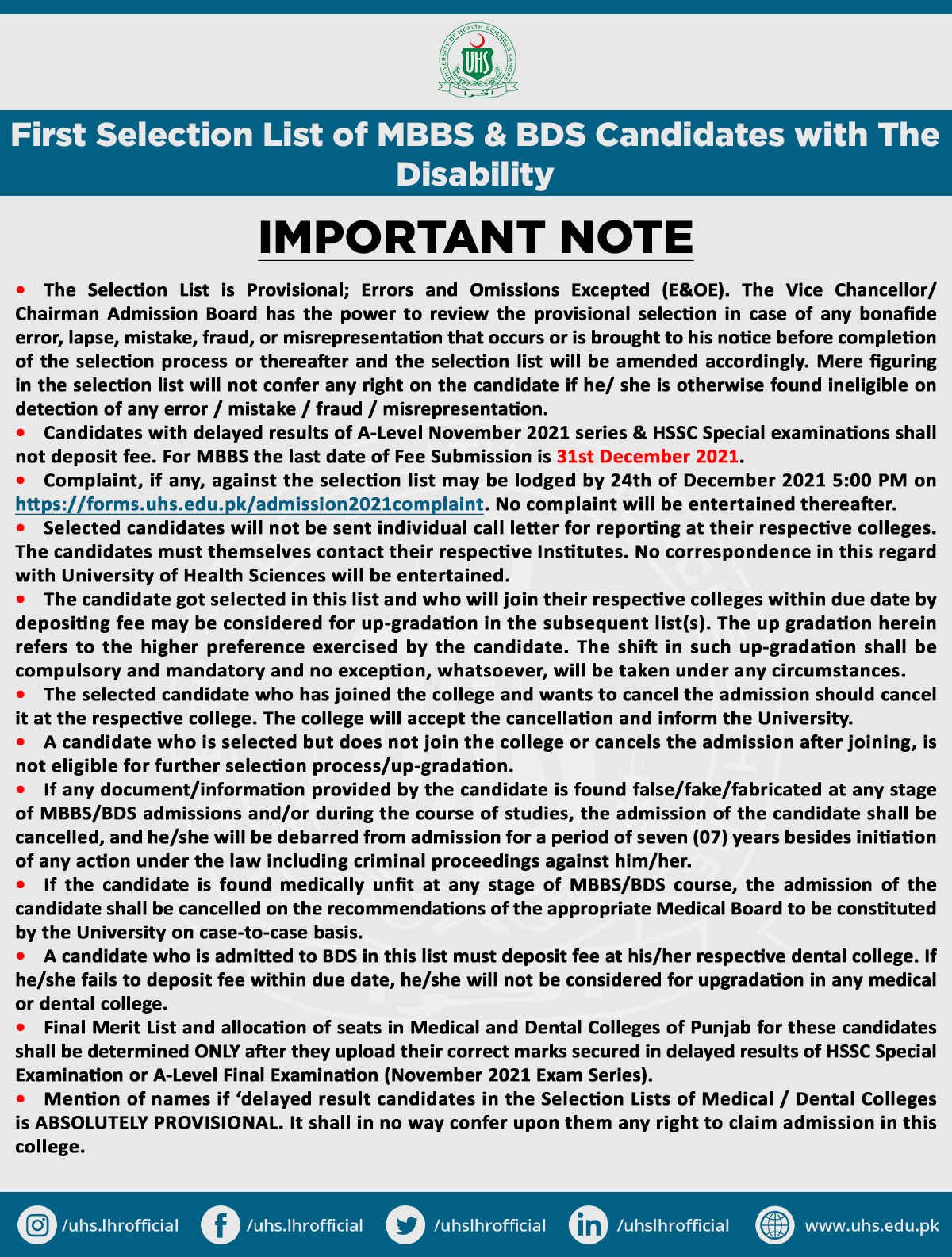 - To view the merit list of MBBS & BDS Disabled Candidates, visit the official UHS website