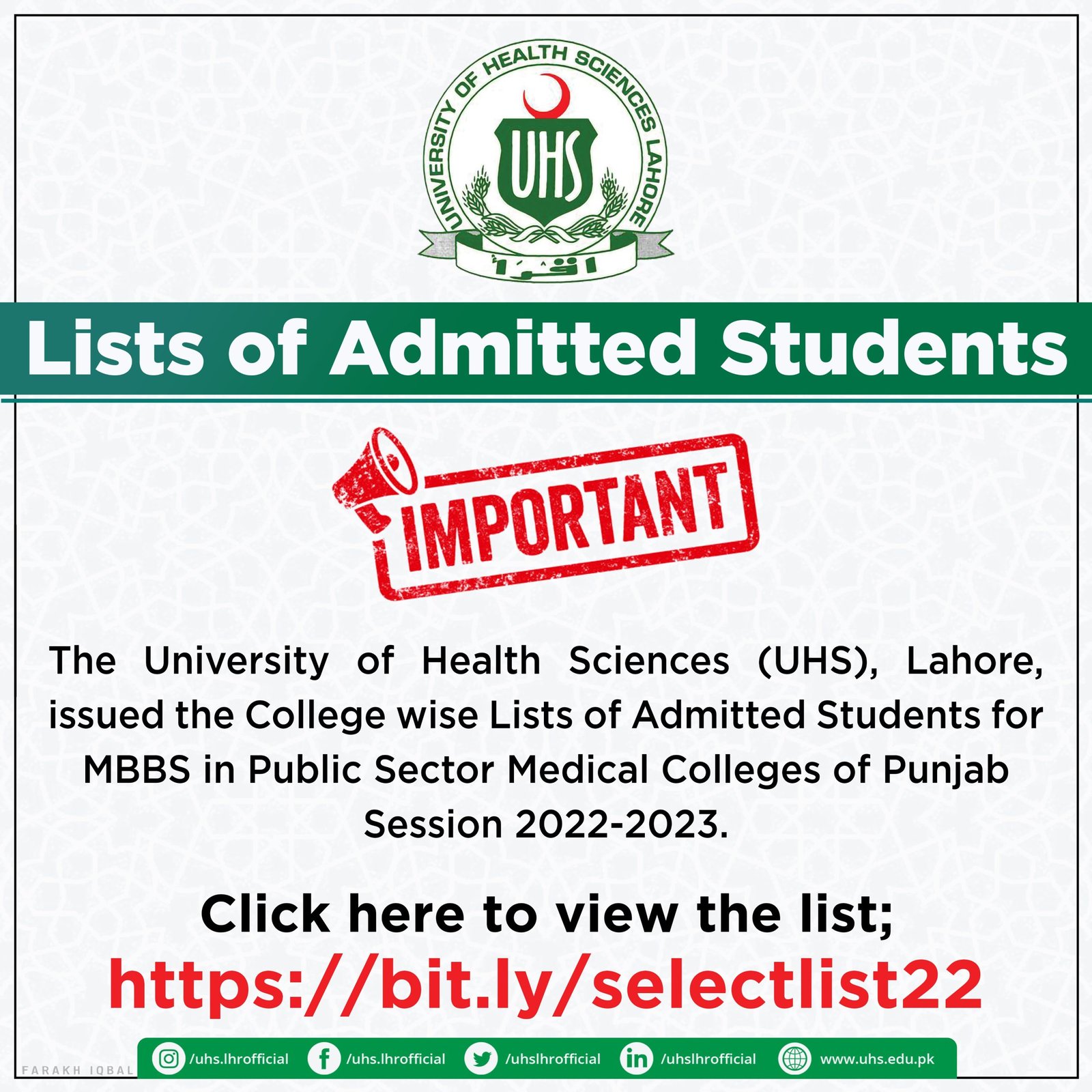 Recently, we learned about the latest notification by the University of Health Sciences Lahore regarding the list of admitted students. We know you are looking for that list which is why you are on our website. The UHS management has posted the college-wise lists of contenders who got admission for the MBBS session 2022-23.