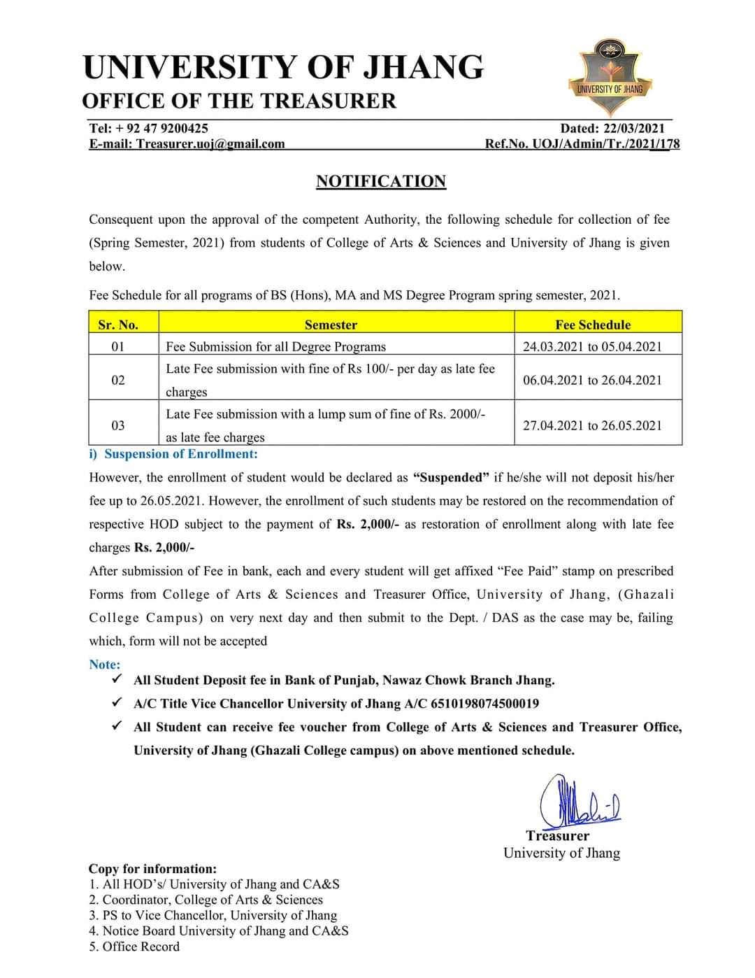 University Of Jhang Issued the Fee Schedule of Semester Spring 2021