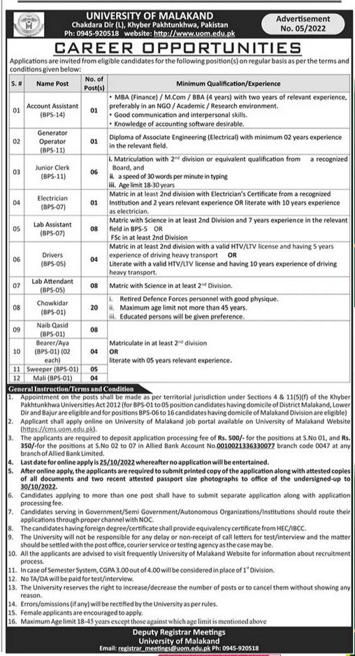 University of Malakand Jobs Application Deadline: