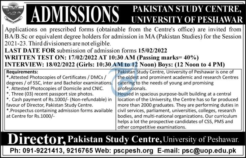 The last date to apply for admission to the University of Peshawar is 15 February 2022.