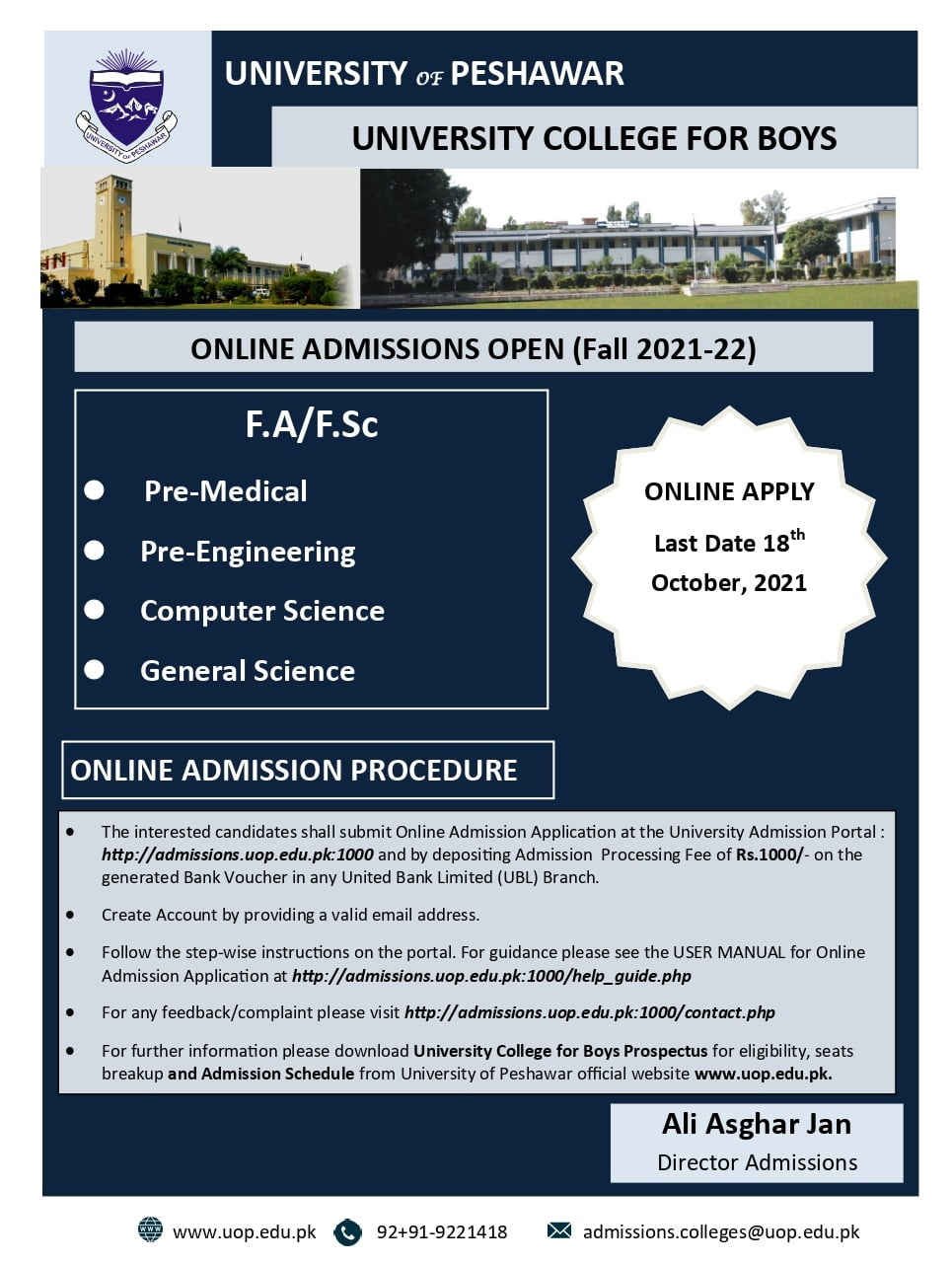 Are you in search of the best college? If yes, then you are absolutely at the perfect place. The University of Peshawar has already announced the admission program for the year 2021. They offer admission in FA and FSc programs. Firstly they announce that the last date for submission of the application is 11th October 2021. But now, the result declaration date of SSC-II is postponed. Therefore, they extend the admission date. Now the date for submission of the admission form is 18th October 2021. The candidate who hasn’t applied due to the shortage of time will now have a chance to apply before the due date. Now, the UoP revised the admission date. Hence the last date for submission of the application is 18th October 2021