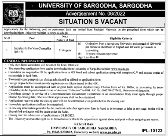The University of Sargodha is accepting applications for the latest career job opportunities for session 2022. They are looking for highly talented and active individuals for Secretary to the Vice Chancellor (BS-17) position. The qualification required for this position is graduating from a well-recognized institute with relevant experience. It is a full-time job. The last date to apply for this vacant position is 31st October 2022.