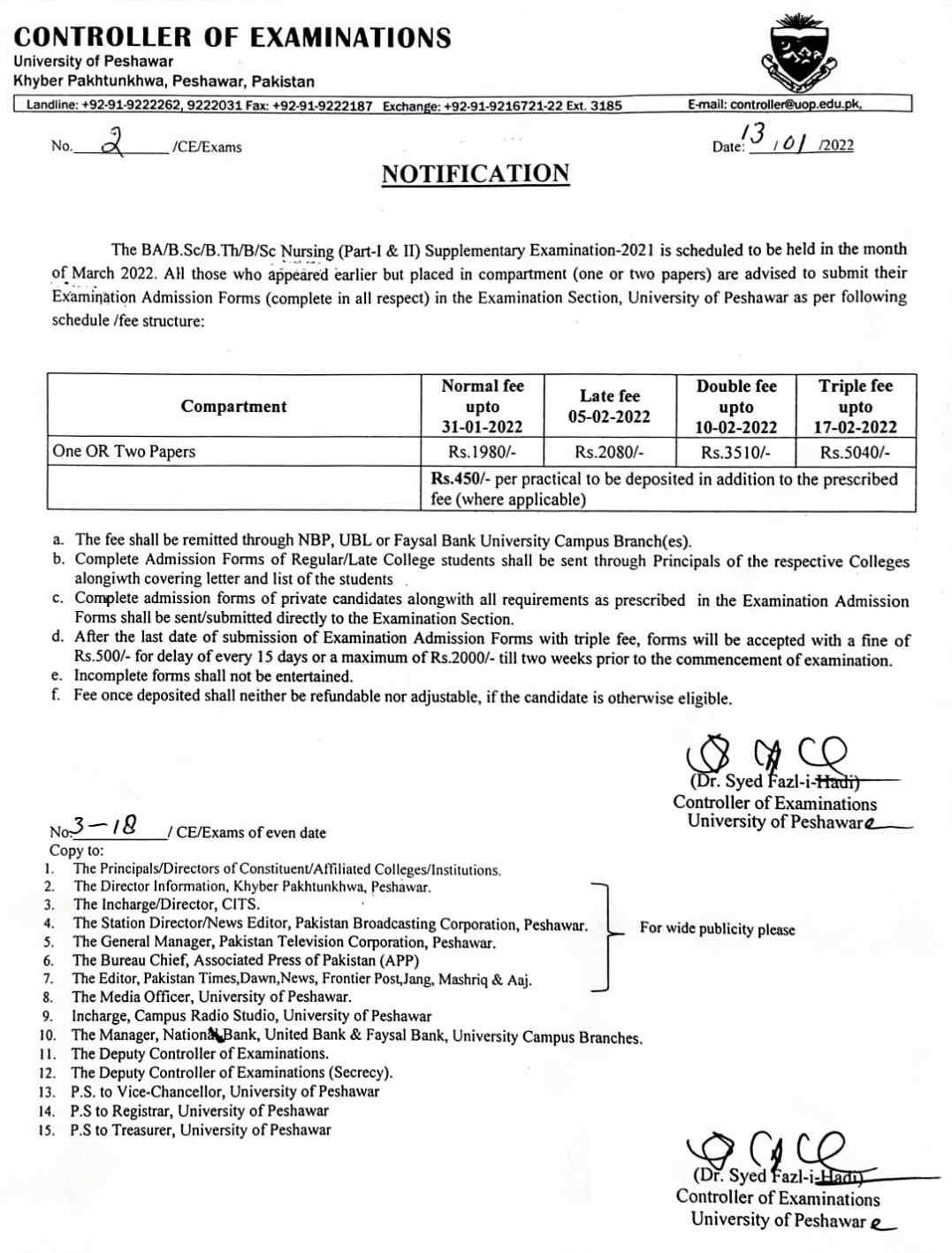 According to the latest Peshawar University notification, it is to notify all students that Peshawar issued the admission notice of various degree programs. As per the notification, they announced the schedule of Bachelors in Arts and Science, B.Th and BSc Nursing (Part I and II). The supplementary examination of these programs will begin in March 2022. All those applicants who appeared in the Compart are advised to submit their examination form in the examination section. Earlier, they declare the schedule of BA, BSc, and Nursing Theology for the annual examination 2021