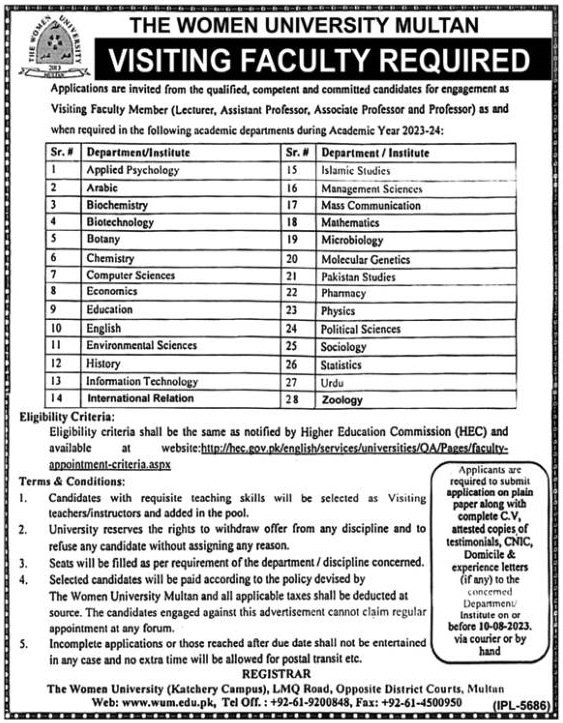 The Women University Multan announced the latest career job opportunities for session 2023. Both males and females can apply. Women University Multan is looking for active and talented individuals for the position of Visiting Faculty. They required highly qualified candidates. They offer jobs in various departments. Applicants having a Master’s degree holder from a well-recognized institute can apply. They advertised these jobs in Daily Jang Newspaper. Those who are interested can apply before the due date. The last date to submit Women University Multan job application is 10th August 2023.